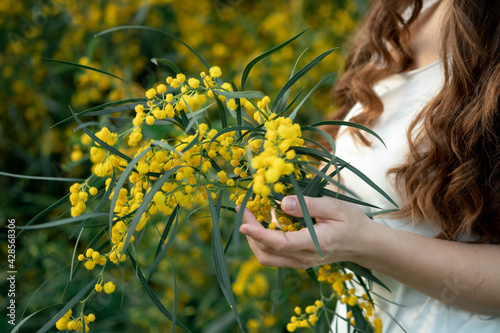 Hand holding bypass secateurs scissors and pruning yellow acacia flower brunches. Seasonal work in the garden.Por view.Spring details
