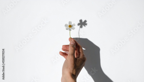 Hand Holding Daisy Casting Leafy Shadow on Sunlit White Background