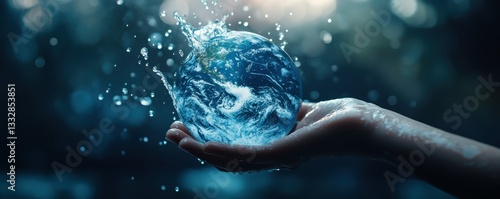 Hand holding Earth globe with water splash on blue bokeh background. World Water Day, Mother Earth day. Save water concept. Environmental problems and protection. Caring for nature and ecology