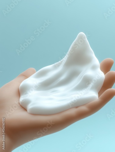 Hand holding foam soap on blue background
