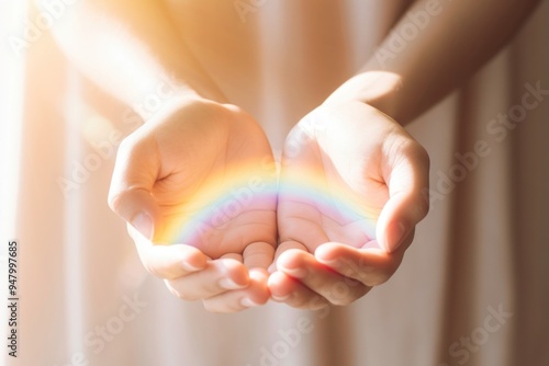 Hand holding rainbow finger.