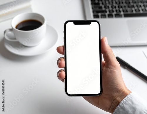 hand holding smartphone with blank screen coffee cup and laptop in background