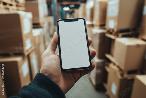 Hand Holding Smartphone with Blank Screen in Warehouse