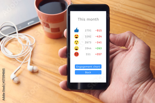 Hand holding smartphone with social media report, analytics chart with icons showing negative red statistics of reach and engagement. Social media profile losing engagement, low interaction.