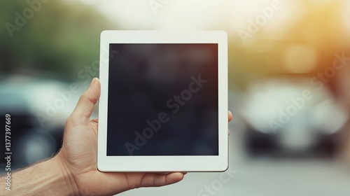 Hand holding tablet in urban environment digital device showcase technology photography bright daylight setting
