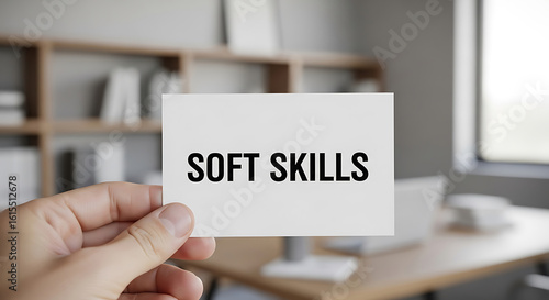 Hand Holding White Card Soft Skills Text Office Background
