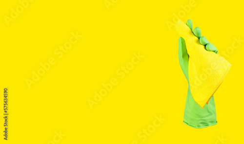 Hand in green glove holding microfiber cloth for wiping dust. Yellow banner background with copy space for text