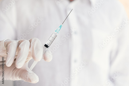 Hand in surgical gloves holding medical injection syringe. Selective focus, copy space