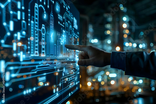 Hand interacting with futuristic touchscreen interface in a high-tech environment, representing innovation and technology concepts.