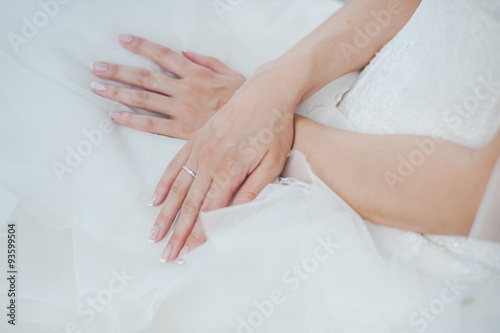 Hand of bride with wedding ring.
