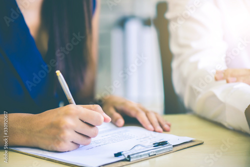 Hand of business woman or secretary take note on paperwork while business meeting at office, business financial presentation conference concept