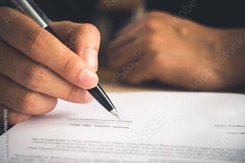 hand of businessman writing on contract/book/notebook, signing a signature for business agreement.