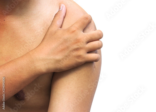 hand of man catches his shoulders with shoulder pain on white background. Health care Concepts