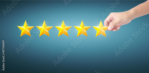 Hand of touching rise on increasing five stars. Increase rating evaluation