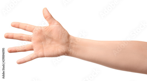 Hand of woman on white background