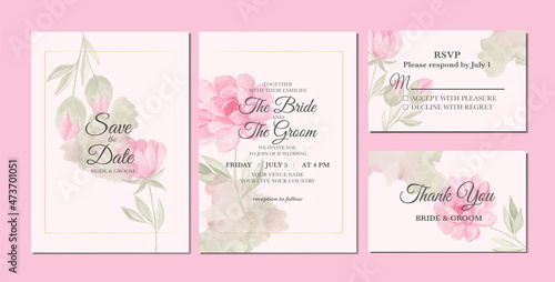 Hand painted of beautiful pink peony flowers watercolor as wedding invitation template.