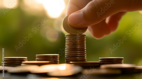 hand placing a coin on a growing stack of coins, symbolizing financial growth, investment, and savings. This image captures the essence of wealth accumulation, economic stability, and future financial