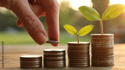 Hand placing small metallic disc onto progressively taller stacks of currency alongside growing green sprouts in soft sunlight