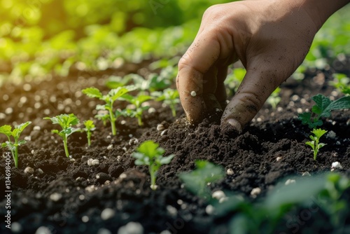 Hand planting seedlings in fertile soil, nurturing new life and growth under sunlight.