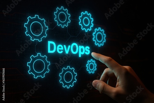Hand pointing to the word Devops surrounded by glowing gears.