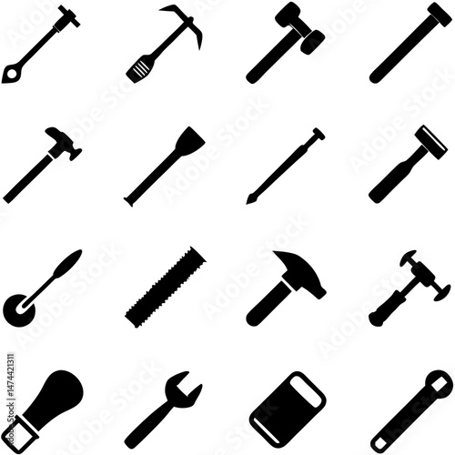 Hand tool assortment: black silhouettes on white background. Tools collection
