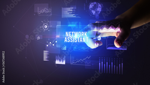 Hand touching NETWORK ASSISTANT inscription, new business technology concept