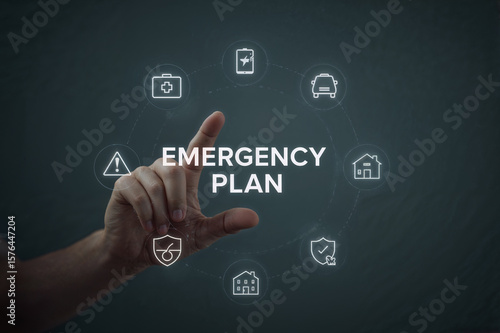 Hand touching screen displaying emergency plan with icons for safety and preparedness