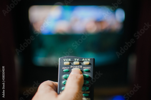 hand using old remote to control television