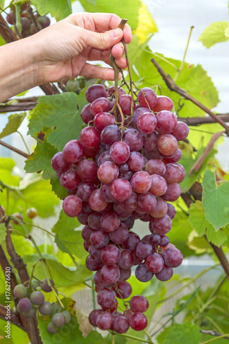 Hand with a brush of red grapes on a vineyard