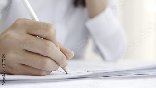 Hand with a pencil holding pen is writing on the notebook