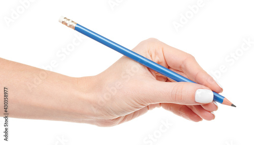 Hand with blue office pencil isolated on white background