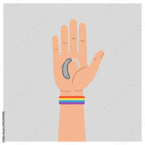 Hand with Hearing Aid and Rainbow Bracelet Against Gray Background