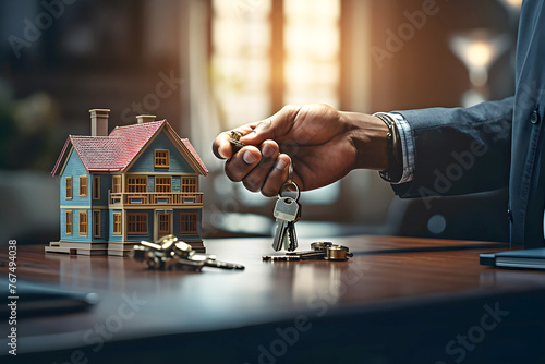 hand with keys against the background of a model of a residential building. real estate design and purchase