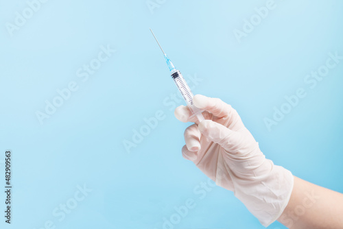 Hand with syringe. Making injection with copy space. Hand holding dose of vaccine.