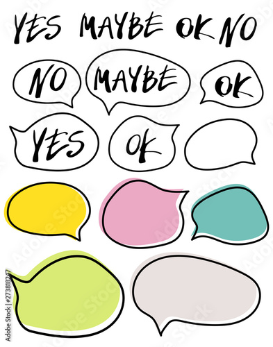 Hand written yes, no, maybe, ok signs in speech bubbles. Set of vector simbols isolated on white background.