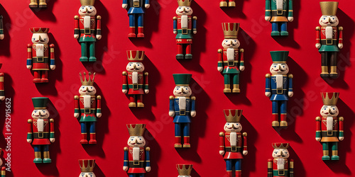 hand-carved wooden nutcrackers, each with a shadow, arranged on a deep red background