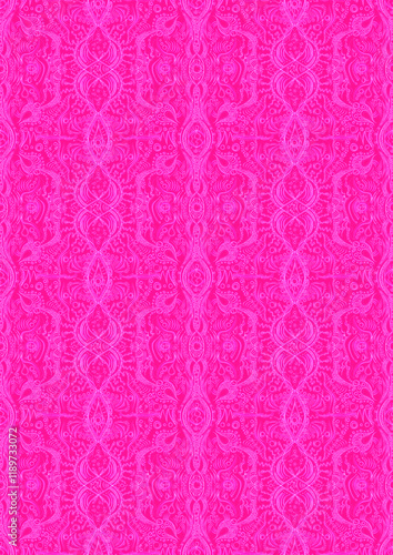 Hand-drawn abstract seamless ornament. Neon pink (plastic pink) background and glowing pattern on it. Cloth texture. Digital artwork, A4. (pattern: p09e)