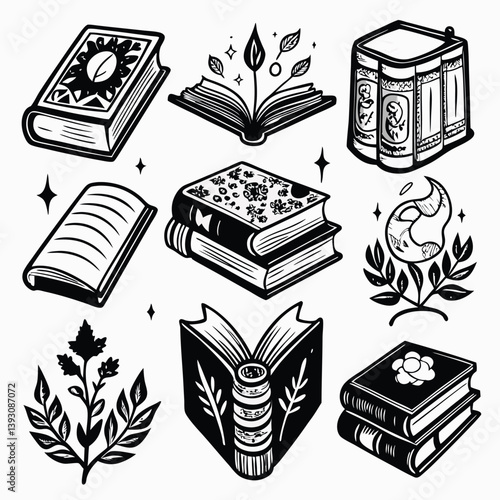 Hand-Drawn Book Stack Doodle Set – 6 Unique Black and White Sketch Illustrations