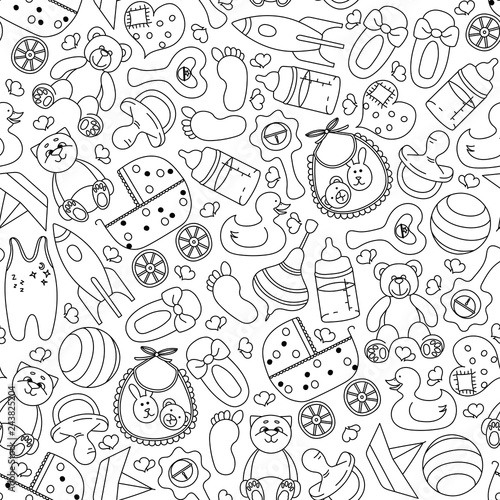 Hand-drawn pattern with children's toys and accessories. Black and white seamless pattern. Vector illustration.