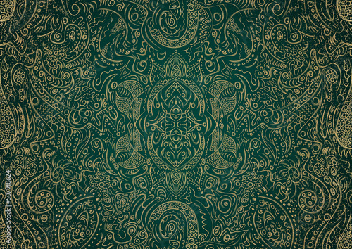 Hand-drawn unique abstract gold ornament on a dark green cold background, with vignette of darker background color and splatters of golden glitter. Paper texture. Digital artwork, A4. (pattern: p01a)