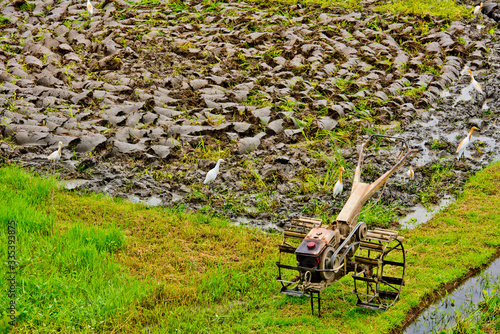 Handheld motor plow in a rice field. Ubud, Bali, Indonesia.