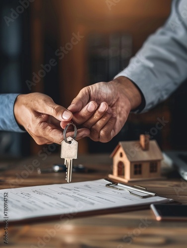Handover of house keys against a backdrop of signed real estate agreements, marking the culmination of a property transaction