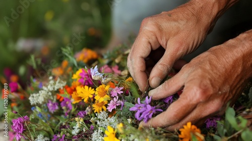 Hands arranging a colorful wildflower bouquet outdoors.