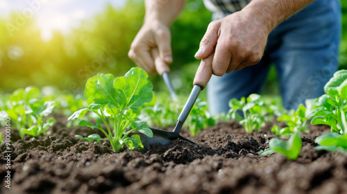 Hands carefully cultivate young green plants in fertile soil under warm, golden sunlight on a sunny day