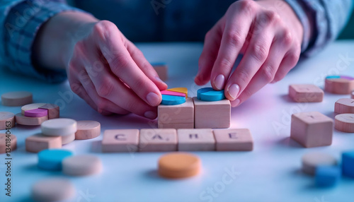 hands close up, colorful wooden blocks, arranging, organizing