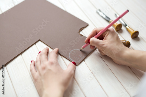 Hands draw and carve a linocut, concept handicraft