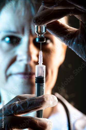 hands filling a syringe from vaccine bottle