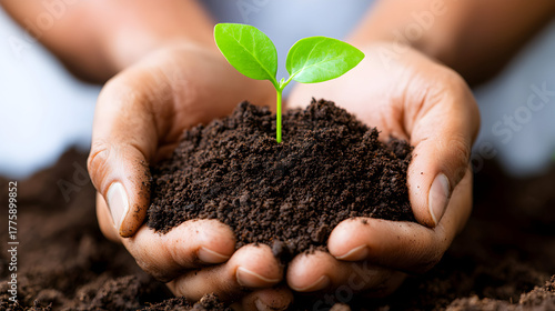 Hands gently holding a young green plant with rich soil, symbolizing new life, growth, and environmental care in natural light.
