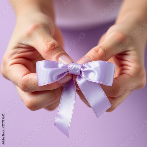 Hands gently holding lavender ribbon for cancer awareness on World Cancer Day, promoting unity, healing, and patient support