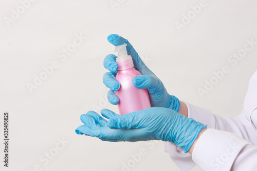 Hands hold a bottle of disinfectant spray and spray. Hands in the process of cleaning with a medical disinfecting liquid, on a white background, close-up